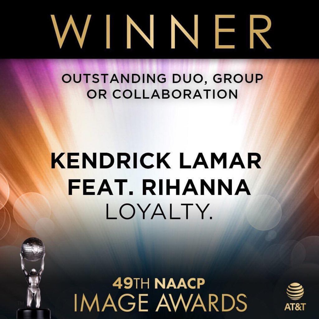 Rihanna and Kendrick Lamar won the NAACP Image Award for "Outstanding Duo, Group or Collaboration" for LOYALTY.